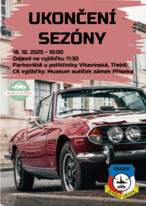 Tradiční podzimní zakončení veteránské sezóny.V sobotu 18.10.2025Sraz v 10:00 na parkovišti u Polikliniky Vltavínská11:00-12:00 Odjezd na vyjížďku – cíl je v přípravěBližší informace budou dodány
